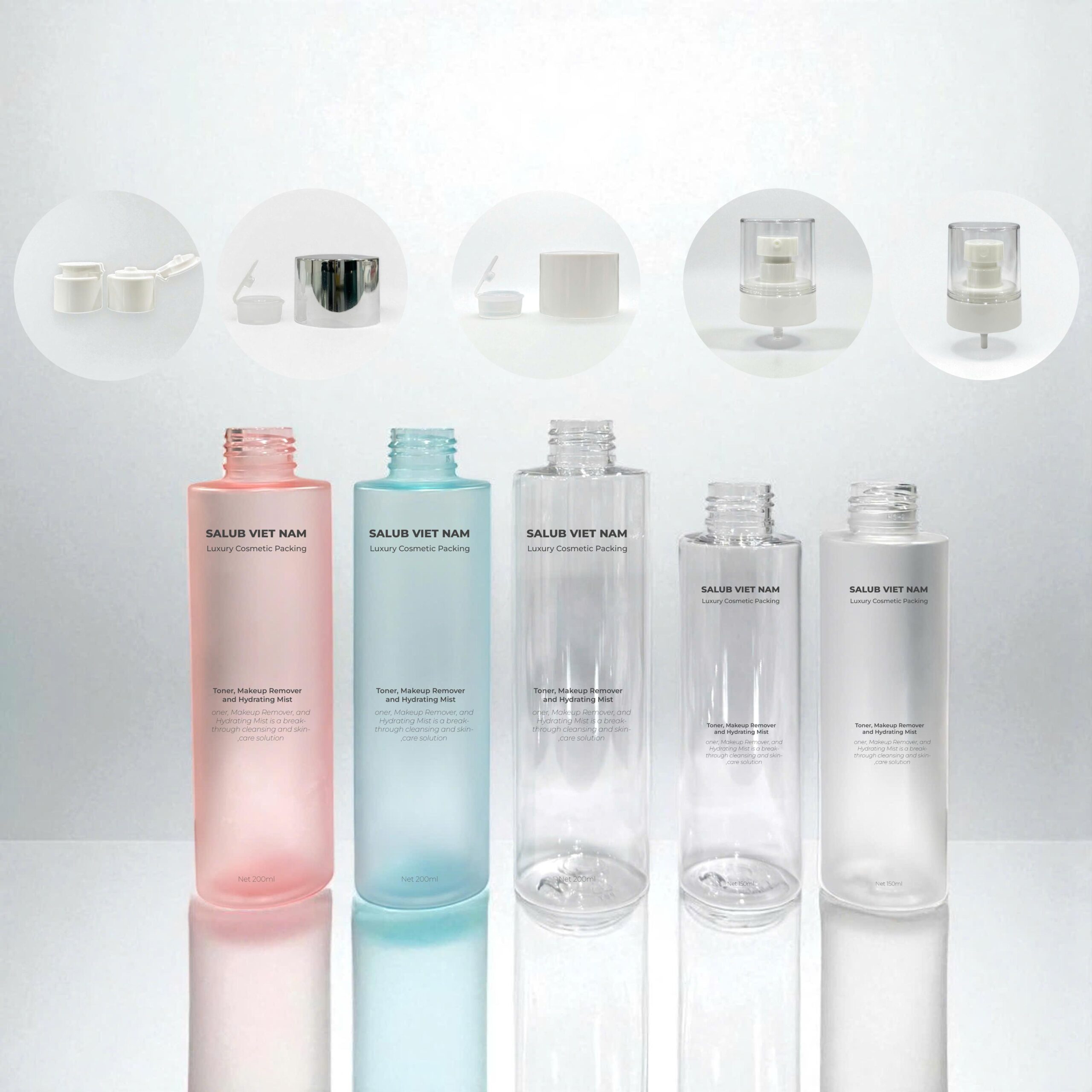Thân chai: Được làm từ các chất liệu như PET (nhựa trong suốt), thủy tinh, nhôm aluminum, hoặc HDPE/PP. Thân chai cần có độ kín khít cao để bảo vệ sản phẩm bên trong khỏi không khí, ánh sáng và vi khuẩn. Dung tích phổ biến dao động từ 30ml (dạng mini du lịch) đến 300ml (sử dụng tại nhà hoặc chuyên nghiệp).